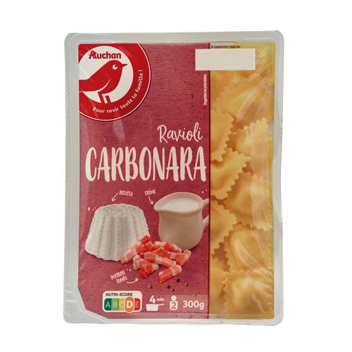 Ingrédients : Farce 50% : ricotta (sérum de LAIT, LAIT, crème (LAIT), sel) 11%, crème (LAIT) 7,5%, ŒUFS 6,6%, chapelure (farine de BLÉ tendre, eau, sel, levure), sérum de LAITen poudre, poitrine fumée (viande de porc, sel, arômes naturels,antioxydant : ascorbate de sodium conservateur : nitrite de sodium) 4,7%, fromage pecorino au lait de brebis, jambon cru fumé speck (viande de porc, sel, épices, dextrose,plantes aromatiques, conservateurs : nitrite de sodium, nitrate depotassium), eau, sel, poivre noir 0,1%. Pâte 50% : farine de BLÉ tendre 25%, semoule de BLÉ dur 10,7%, ŒUFS 10%, eau. Traces éventuelles de crustacés, poissons, fruits à coque, céleri et mollusques. Pourcentages exprimés sur le total de la recette. Élaboré à partir de lait origine UE et non UE