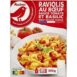 Ingrédients : Tomate pelée concassée au jus 45% (tomate 31,6%, jus de tomate 13%,acidifiant : acide citrique, affermissant : chlorure de calcium), pâtes farciesau bœuf cuisiné 40% [pâte 22% : semoule de BLÉ dur 8,6%, eau, OEUFS, farce 18% : préparation de viande de bœuf cuite 7,2% (viande de bœuf 6,5 % (origine France), eau, fécule de pomme de terre,sel), couscous (BLÉ), concentré de tomate, tomates, coulis de tomate,oignons, eau, sel, huile d'olive, sucre, ail déshydraté, thym, poivre], oignon 4%,crème (LAIT origine France), huile d'olive, fromage Grana Padano AOP* 1,2% (LAIT origine Italie, contient OEUF), sucre, ail en purée (ail, sel, acidifiant : acidecitrique), amidon de maïs, fromage Parmigiano Reggiano AOP* 0,5% (LAIT origine Italie),basilic 0,5%, sel, origan. Traces éventuelles de soja, céleri, moutarde,poisson, mollusques, crustacés, graines de sésame, fruits à coque et arachides. *AOP : Appellation d'Origine Protégée