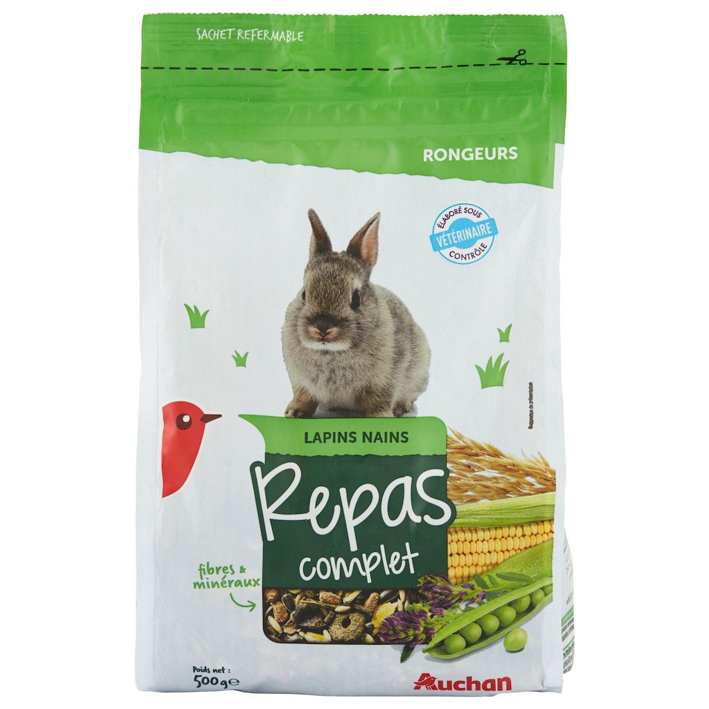 Vif et malin, le lapin nain s'apprivoise facilement. Il aime les caresses et la compagnie. Véritable herbivore, il a besoin d'une alimentation riche en fibres.Une étroite collaboration entre Auchan et des vétérinaires a permis de développer ce mélange spécifique, parfaitement adapté aux besoins nutritionnels de l'animal. Pour le plus grand plaisir de votre lapin, vous pouvez également lui donner un peu de foin en guise de friandises.