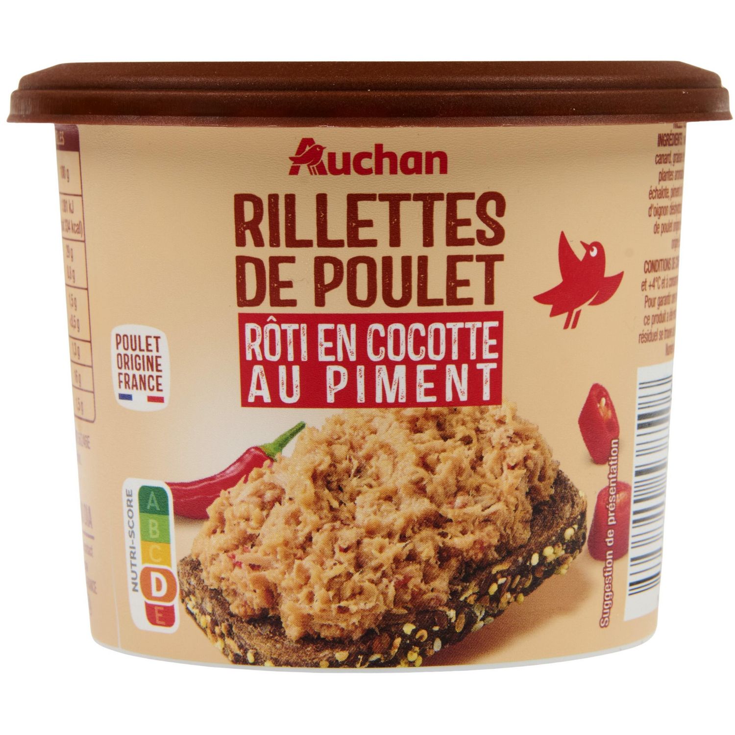 Ingrédients : Viande de poulet 78,5%, graisse de canard, graisse de poulet, peau de poulet, épices et plantes aromatiques, carotte, poivron rouge, sel, échalote, piment de Cayenne 0,7%, tomate, miel, pulpe d'oignon déshydraté, vinaigre d'alcool. Élaboré à partir de poulet origine France et de piment de Cayenne origine Espagne, Inde et Pérou.