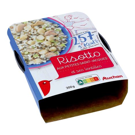Eau, riz cuit 14% (eau, riz), lentilles 14%, noix de Saint-Jacques* 11% (mollusques), champignon 7.5% (champignon de Paris, eau, sel), poireau 5.7%, jus de moule (mollusques), crème fraîche (lait), crème de riz, oignon frit (oignon, huile d'olive vierge, sel), bouillon de légumes (eau, sel, huile de colza, carotte, oignon, céleri, thym, laurier, badiane), vin blanc, ciboule, fromage (lait), amidon de riz, beurre (lait), farine de blé, sel, fibre de chicorée, coriandre, gingembre, piment de Cayenne, poivre. Pourcentages exprimés sur le total de la recette.Traces éventuelles de poissons, crustacés. Elaboré à partir de lait origine UE. *Zygochlamys patagonica - origine Argentine.