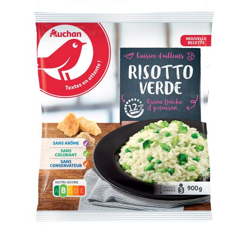 Ingrédients : Riz précuit 43% (eau, riz), eau, crème fraîche 9% (LAIT) , brocolis 7,7%, haricot sabre 7,7%, petit pois 7,7%, fèves de SOJA 4%, Parmesan 3% (LAIT), mozzarella (LAIT), amidon, sel, ail, poivre. Traces éventuelles de poisson, crustacés, mollusques, céleri, œufs, moutarde, céréales contenant du gluten (blé) et graines de sésame. Elaboré à partir de lait origine UE