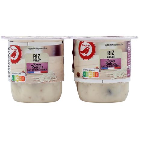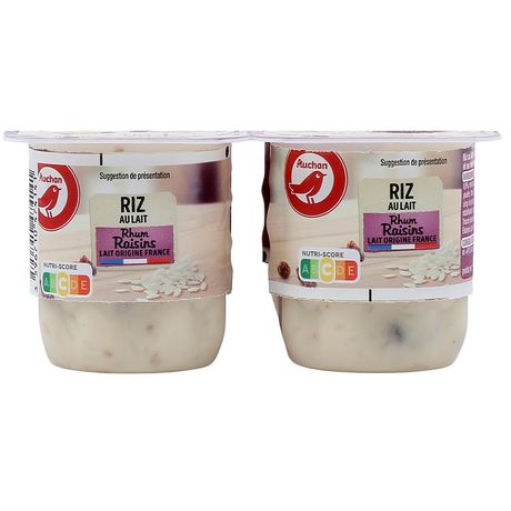 Avec le Riz au lait Rhum raisins Auchan savourez un délicieux riz au lait à la texture crémeuse, fabriqué avec du lait origine France