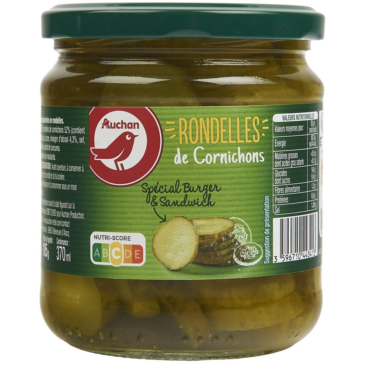 Ingrédients : rondelles de cornichons 52% (contient des SULFITES), eau, sucre, vinaigre d'alcool 4.3%, sel, arômes naturels, extrait de curcuma. Traces éventuelles de moutarde.