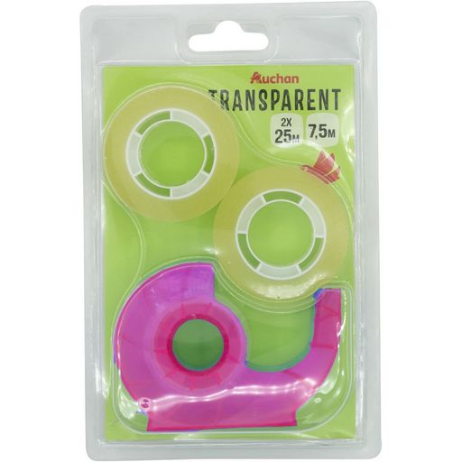 En savoir +Facile d'utilisation, ce dévidoir coloré et son rouleau de scotch sont un indispensable à la maison comme au bureau. Il offre une capacité de 7,5 m de ruban adhésif. La lame métallique du dévidoir permet de couper le ruban rapidement et en un seul geste. Le dévidoir est vendu avec un rouleau intégré et 2 rouleaux d’adhésifs supplémentaire de 25 M pour pouvoir les remplacer après utilisation totale.