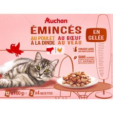 Emincés en gelée à la dinde : Viandes et sous-produits animaux (dont dinde 4%), sous-produits d'origine végétale (inuline de chicorée 0.4%), substances minérales, sucres.