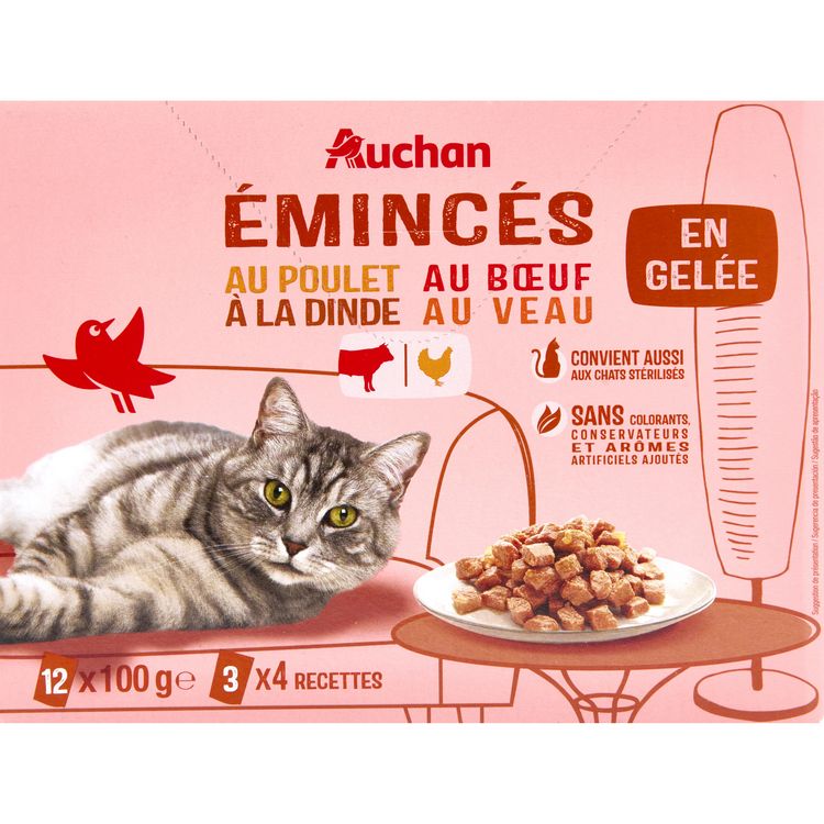Emincés en gelée au veau : Viandes et sous-produits animaux (dont veau 4%), sous-produits d'origine végétale (inuline de chicorée 0.4%), substances minérales, sucres.