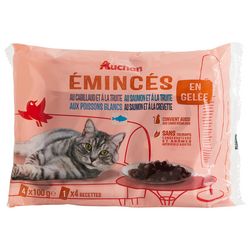 Emincés en gelée au cabillaud et à la truite : Viandes et sous-produits animaux, poissons et sous-produits de poissons (cabillaud 4%, truite 4%), sous-produits d'origine végétale (inuline de chicorée 0.4%), substances minérales.