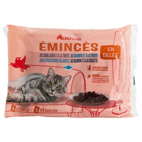 Emincés en gelée au poisson blanc : Viandes et sous-produits animaux, poissons et sous-produits de poissons (poisson blanc 4%), sous-produits d'origine végétale (inuline de chicorée 0.4%), substances minérales.