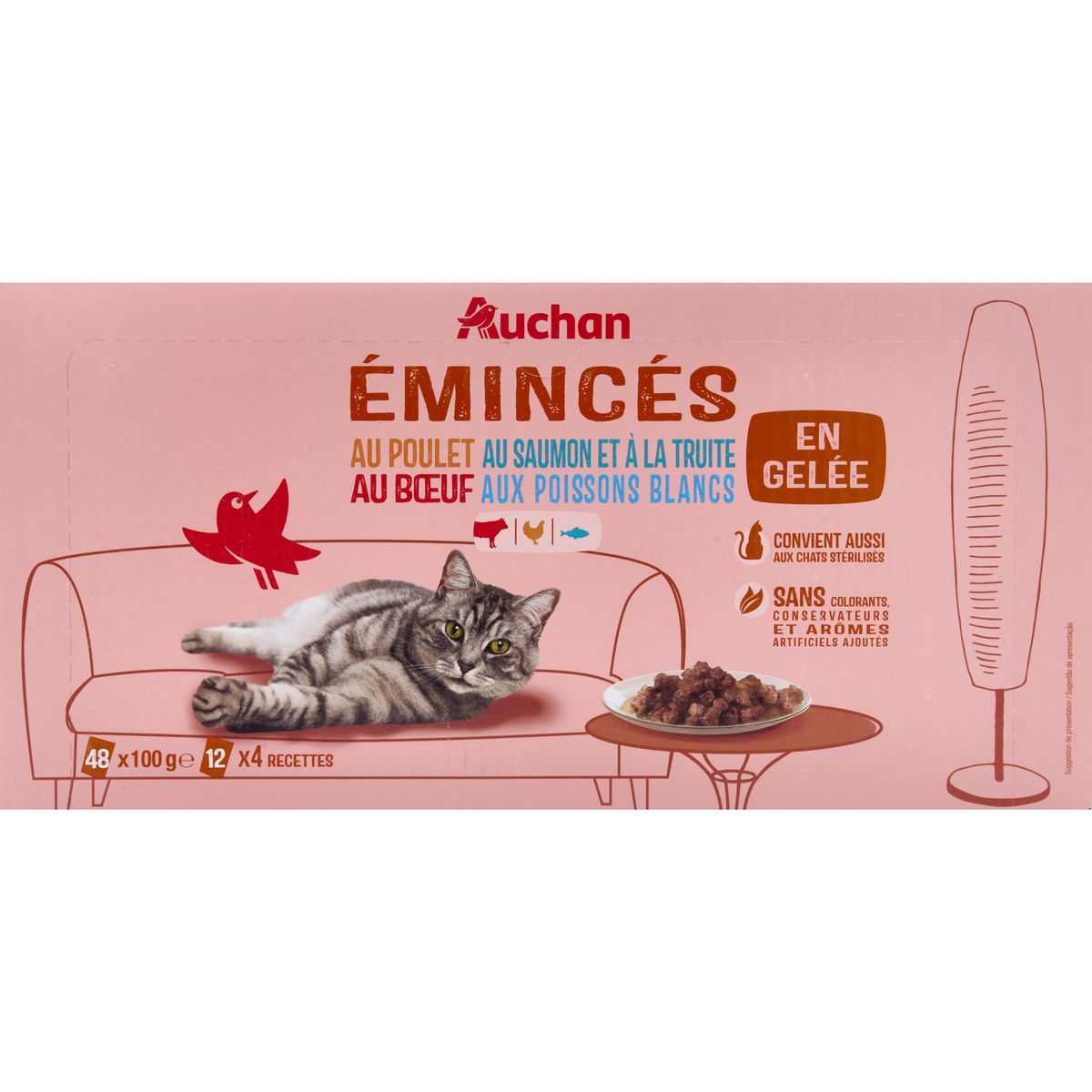 Emincés en gelée au poisson blanc : Viandes et sous-produits animaux, poissons et sous-produits de poissons (poisson blanc 4%), sous-produits d'origine végétale (inuline de chicorée 0.4%), substances minérales.