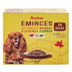 Emincés en gelée à l'agneau : Viandes et sous-produits animaux (dont agneau 4%), huiles et graisses (huile de tournesol 0.5%), sous-produits d'origine végétale (inuline de chicorée 0.4%), extrait de protéines végétales, substances minérales.