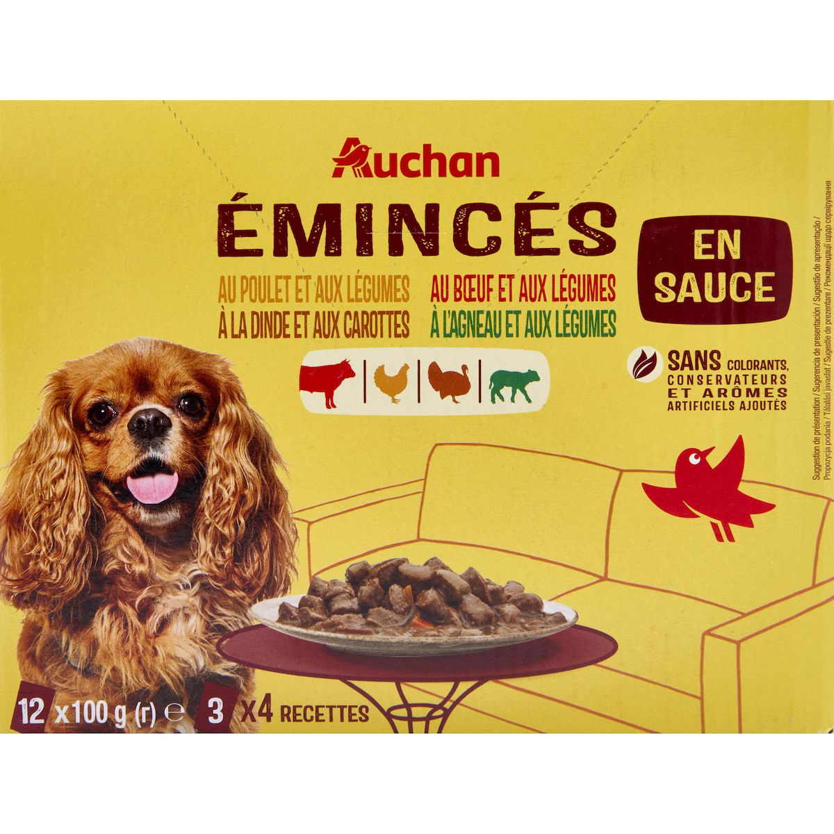 Emincés en sauce à l'agneau et aux légumes : Viandes et sous-produits animaux 36% (dont agneau 4%), céréales, huiles et graisses (huile de tournesol 0.5%), extrait de protéines végétales, sous-produits d'origine végétale (inuline de chicorée 0.4%), substances minérales, légumes (mélange petits pois et carottes déshydratés 0.45%, équivalent à 4% de légumes), sucres.