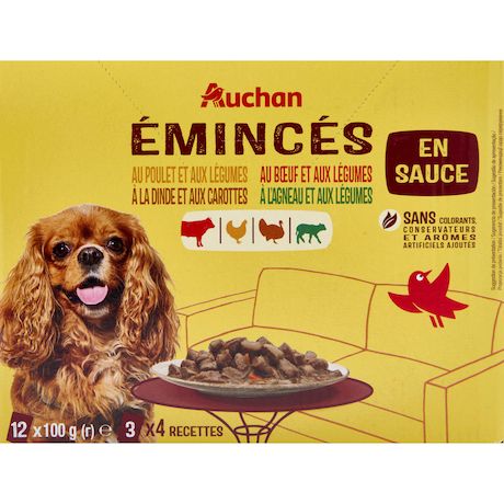 Emincés en sauce à la dinde et aux carottes : Viandes et sous-produits animaux 36% (dont dinde 4%), céréales, huiles et graisses (huile de tournesol 0.5%), extrait de protéines végétales, sous-produits d'origine végétale (inuline de chicorée 0.4%), substances minérales, légumes (carottes déshydratées 0.45%, équivalent à 4% de légumes), sucres.