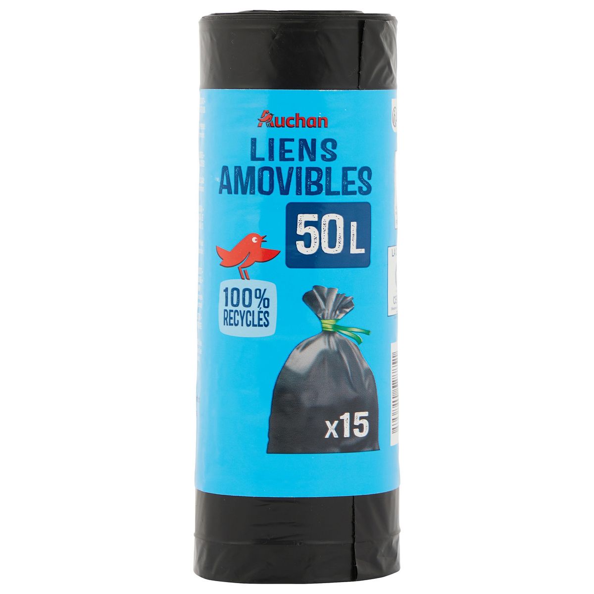 15 Sacs poubelles 50 litres à liens amovibles. Composés de 100% de plastique recyclé, ils sont fabriqués en France.