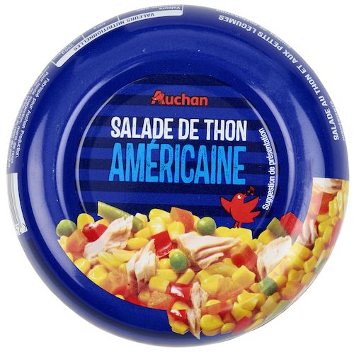 Maïs en grains 24.3%, thon Listao (POISSON) 20%, carottes 13.4%, poivrons rouges 10%, eau, oignons 7.5%, haricots verts 4.4%, petits pois 4.1%, huile de colza, sucre, vinaigre d’alcool, sel, MOUTARDE de Dijon (eau, graines de MOUTARDE, vinaigre d'alcool, sel, acidifiant : acide citrique), épaississant : gomme guar.Traces éventuelles de blé, d'oeufs et de lait.