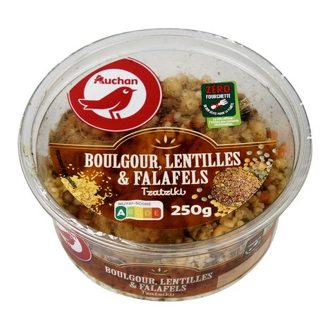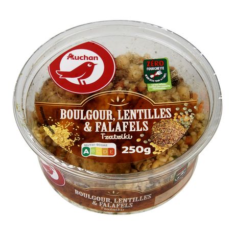 Salade composée à base de boulgour fin cuit, d’une préparation tartinable (16%) à base de concombres, yaourt grec et aneth, de lentilles vertes et rouges cuites, de préparations cuites falafel à base de pois chiches, fèves, coriandre et menthe.