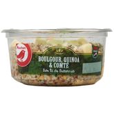 Ingrédients : Boulgour fin cuit 33,1% (eau, BLÉ dur précuit concassé), butternut grillé10,7%, Comté AOP 8% ( LAIT origine FRANCE, collecté dans la zone d'appellation), haricots Azukis cuits, petit ÉPEAUTRE cuit7,5% (BLÉ d'ÉPEAUTRE, eau), huile de colza, quinoarouge cuit 6,6% (eau, quinoa rouge), NOIX, eau, jeunes pousses d’épinards, huile de NOIX, échalote, fromage nature ( LAIT origine France) 1,4%,sel, MOUTARDE de Dijon, vinaigred’alcool, miel d’acacia, jaune d’ ŒUF ,poivre blanc, amidon modifié de pomme de terre, épaississant : gomme xanthane. Traceséventuelles de soja, céleri, graines de sésame, poissons, crustacés, mollusques, autres fruits à coque et autres céréales contenant du gluten. Pourcentages exprimés sur le total de la recette.