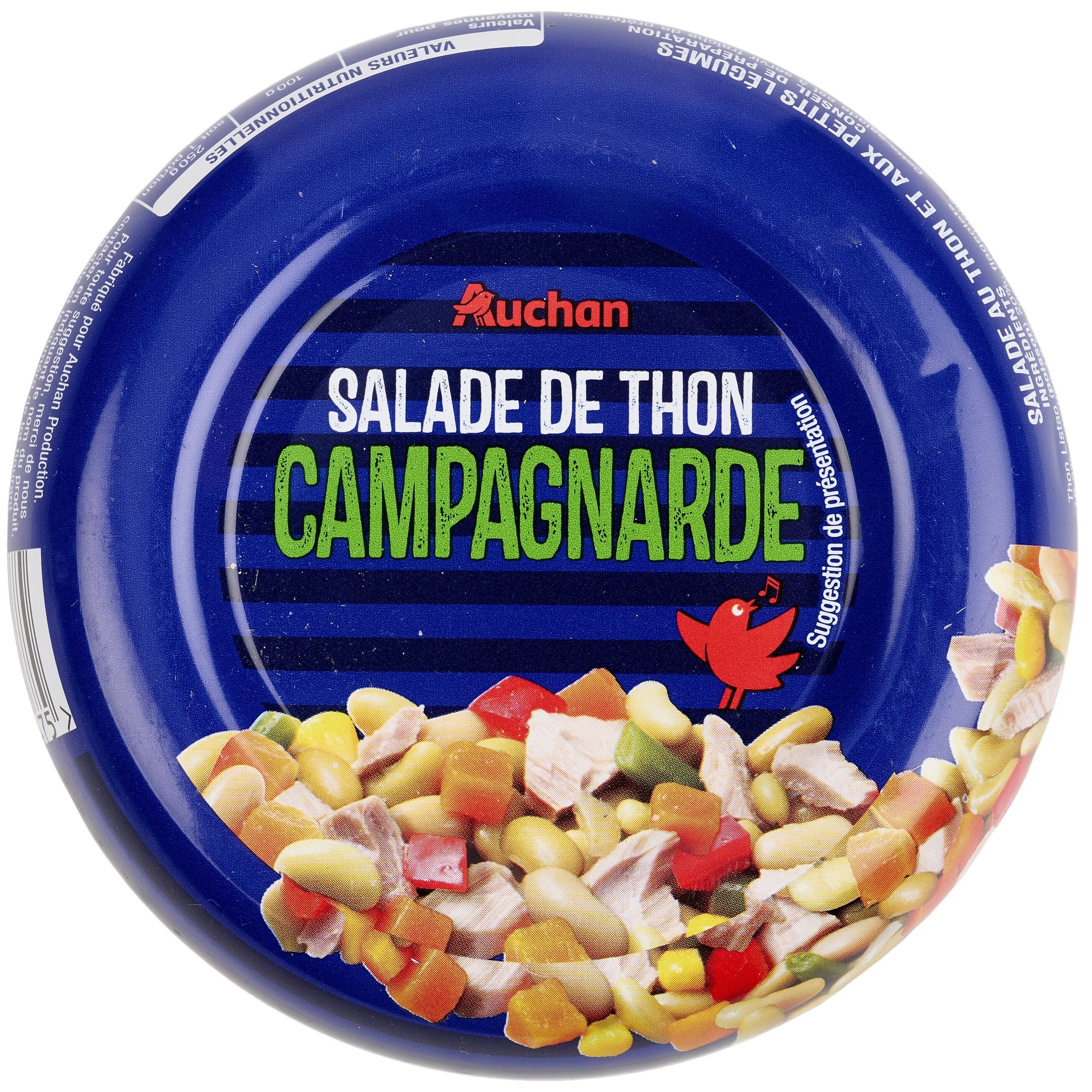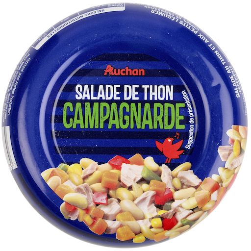 Ingrédients : Thon Listao (POISSON) 20%, flageolets 18.3%, carottes 12.5%, haricots blancs 12.1%, eau, oignons 6.4%, huile de colza, haricots verts 4%, poivrons rouges 4%, mais doux en grains 3.3%, vinaigre d’alcool, fond de volaille aromatisé (dextrose, sel, matières grasses et viande de volaille, arôme naturel), sel, épices et aromates épaississants : farine de graines de caroube, gomme guar arôme naturel d'ail, amidon de riz, colorant : extrait de paprika, arôme naturel. Traces éventuelles de blé, d'œufs, de lait et de moutarde.