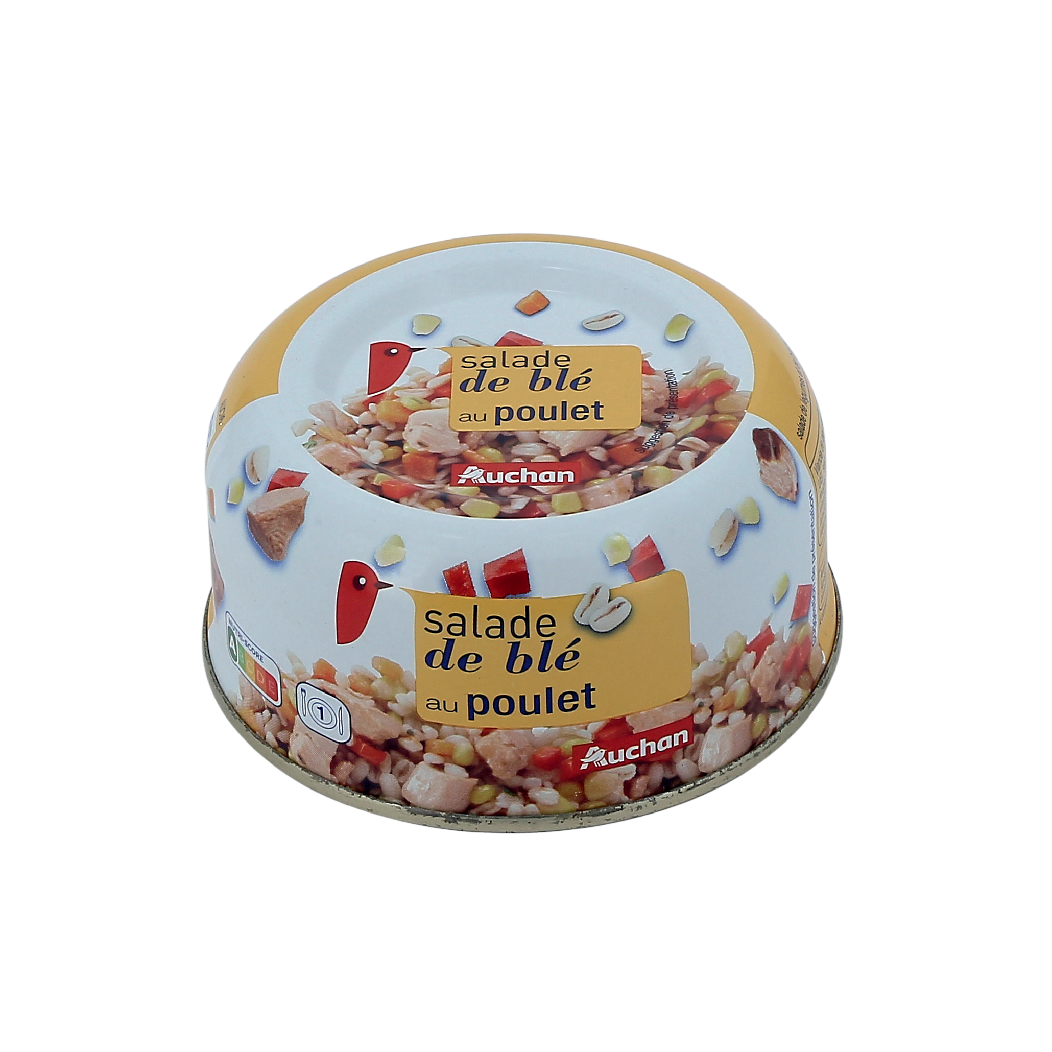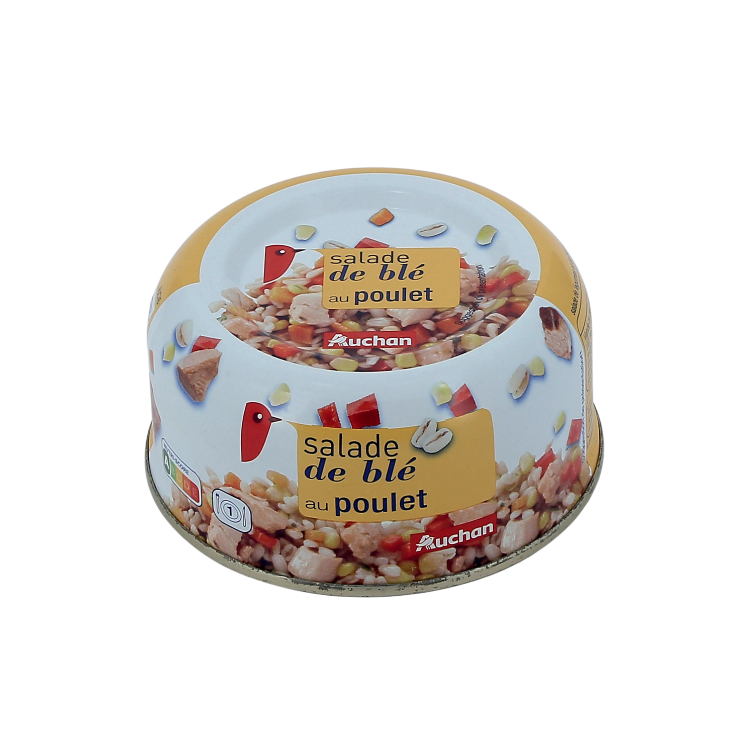 Ingrédients : Viande de poulet traitée en salaison 21% (cuisse de poulet (origine UE), sel), maïs doux en grains 15%, carottes 13%, eau, poivrons rouges 9.9%, oignons 9.7%, BLÉ dur précuit 9.5%, huile de colza, vinaigre d’alcool, huile d’olive vierge extra, aromates et épices, sel, amidon de riz, épaississant : gomme guar, arôme naturel d'ail, arôme naturel, colorant : extrait de paprika. Traces éventuelles de poisson, d'oeufs, de lait et de moutarde.
