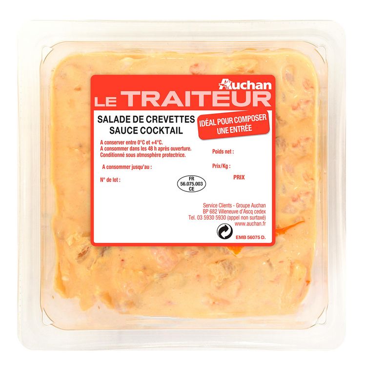 Ingrédients : CREVETTES décortiquées cuites 30%, SURIMI 22% (eau, chair de POISSON 6,6%, amidon de BLE, amidon de pomme de terre, huile de colza, blanc d'ŒUF réhydraté, sucre, sel, arôme (contient CRUSTACES), colorant : extrait de paprika), ananas préservés 17,3% (ananas, eau, sucre, acidifiant : acide citrique, antioxydant : acide ascorbique), huile de colza, eau, CREME, purée d’ananas 2,1%, whisky, préparation à base de tomate (sucre, tomate déshydratée, amidon modifié de pomme de terre, sel, arômes, acidifiant : acide citrique, poudre de jus de betterave, épices), jaune d’ŒUF, sel, vinaigre d’alcool, amidon modifié de pomme de terre, MOUTARDE de Dijon (eau, graines de MOUTARDE, vinaigre d’alcool, sel), jus de citron concentré, colorant : extrait de paprika, acidifiant : acide citrique, conservateur : sorbate de potassium, arôme naturel de poivre.