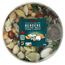 Mélange de salade verte et de pates, garni de fromage de chèvre cendré, mimolette, fourme d'Ambert et de noix dans un bol carton. accompagné d'une dosette d'huile de noix.