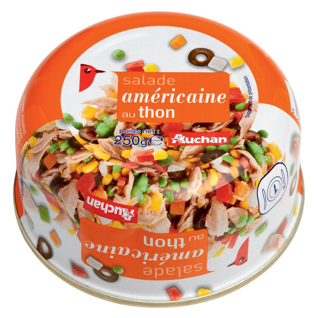 Ingrédients : Maïs doux en grains 25.9%, thon Listao (POISSON) 20%, poivrons rouges et verts 14.6%, carottes 9.7%, oignons 8.4%, huile de colza, eau, petits pois 4.3%, vinaigre d’alcool, olives noires 2.1% (olives, sel, fixateur de couleur : gluconate ferreux), sucre, sel, arôme naturel, amidon de riz, épaississant : gomme guar, colorant : extrait de paprika. Traces éventuelles de blé, d'oeufs, de lait et de moutarde.