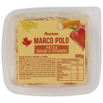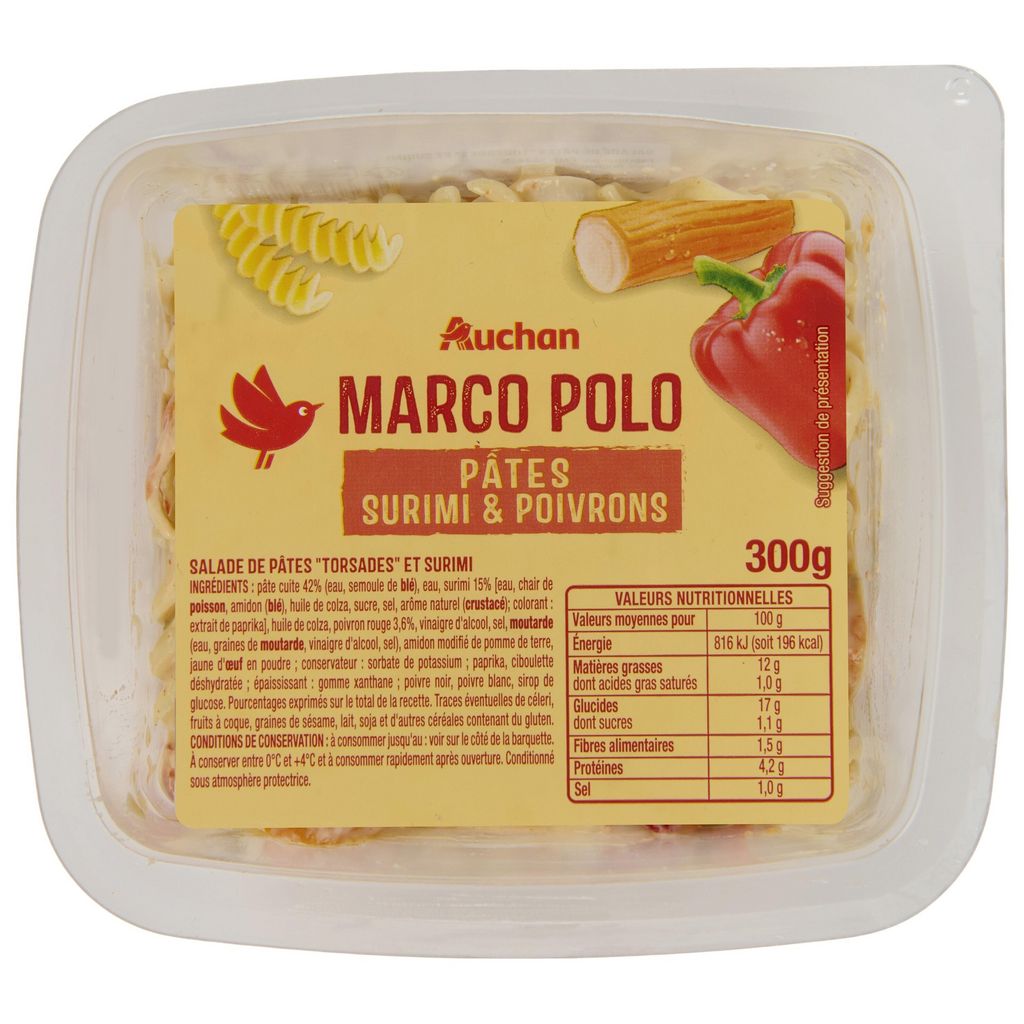 Ingrédients : pâte cuite 42% (eau, semoule de BLÉ), eau, surimi 15% [eau, chair de POISSON, amidon (BLÉ), huile de colza, sucre, sel, arôme naturel (CRUSTACÉ) colorant : extrait de paprika], huile de colza, poivron rouge 3,6%, vinaigre d'alcool, sel, MOUTARDE (eau, graines de MOUTARDE, vinaigre d'alcool, sel), amidon modifié de pomme de terre, jaune d'ŒUF en poudre conservateur : sorbate de potassium paprika, ciboulette déshydratée épaississant : gomme xanthane poivre noir, poivre blanc, sirop de glucose. Pourcentages exprimés sur le total de la recette. Traces éventuelles de céleri, fruits à coque, graines de sésame, lait, soja et d'autres céréales contenant du gluten