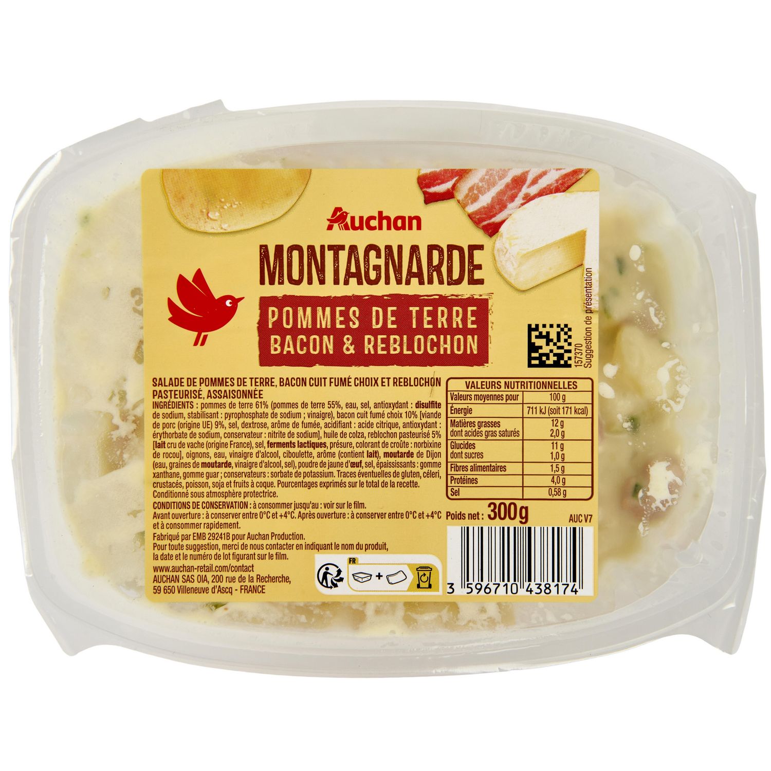 Bonjour, Nous vous remercions d'avoir partagé votre avis sur notre AUCHAN Salade montagnarde 300g. Nous sommes désolés d'apprendre que vous avez été déçu par le produit et que vous le considérez comme une simple salade de pommes de terre, surtout au vu du prix. Nous prenons votre commentaire en compte. Nous sommes toujours à l'écoute de nos clients afin d'améliorer nos produits et de répondre au mieux à leurs attentes. Bien cordialement,