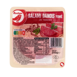 Ingrédients : Viande de porc, gras de porc, sel, sirop de glucose, épices, denrée alimentaire colorante : concentré de betteraves rouges acidifiant : acide citrique antioxydants : acide ascorbique, isoascorbate de sodium conservateur : nitrite de sodium ferments. Fumé au bois de hêtre. Traces éventuelles de moutarde, de protéines de lait, de noix, d'amandes, et de céleri. 100g of the Salami are made of 120g pork
