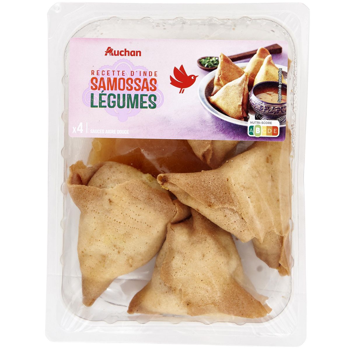 Ingrédients : Samossas aux légumes et au curry frits 83,3% : galette de blé 36% (eau, farine de BLÉ, huile de tournesol, blanc d'OEUF en poudre, sel, émulsifiant : lécithine de colza), légumes 31.6% (chou fleur, carotte, courgette, brocoli, petit pois), oignon, protéine de SOJA texturée, flocon de pomme de terre déshydraté, huile de tournesol, ail, curry 0.6% (contient MOUTARDE), OEUF entier en poudre, amidon de maïs, sel, sucre, cumin. Sauce aigre douce 16,7% : eau, sucre, vinaigre d’alcool, ananas, poivron rouge, amidon modifié de maïs, huile de tournesol, sel, acidifiant : acide citrique, épices et plantes aromatiques (curry, gingembre) stabilisants : gomme guar, gomme xanthane. Pourcentages exprimés sur le total de la recette. Traces éventuelles de crustacés, poisson et lait.