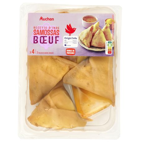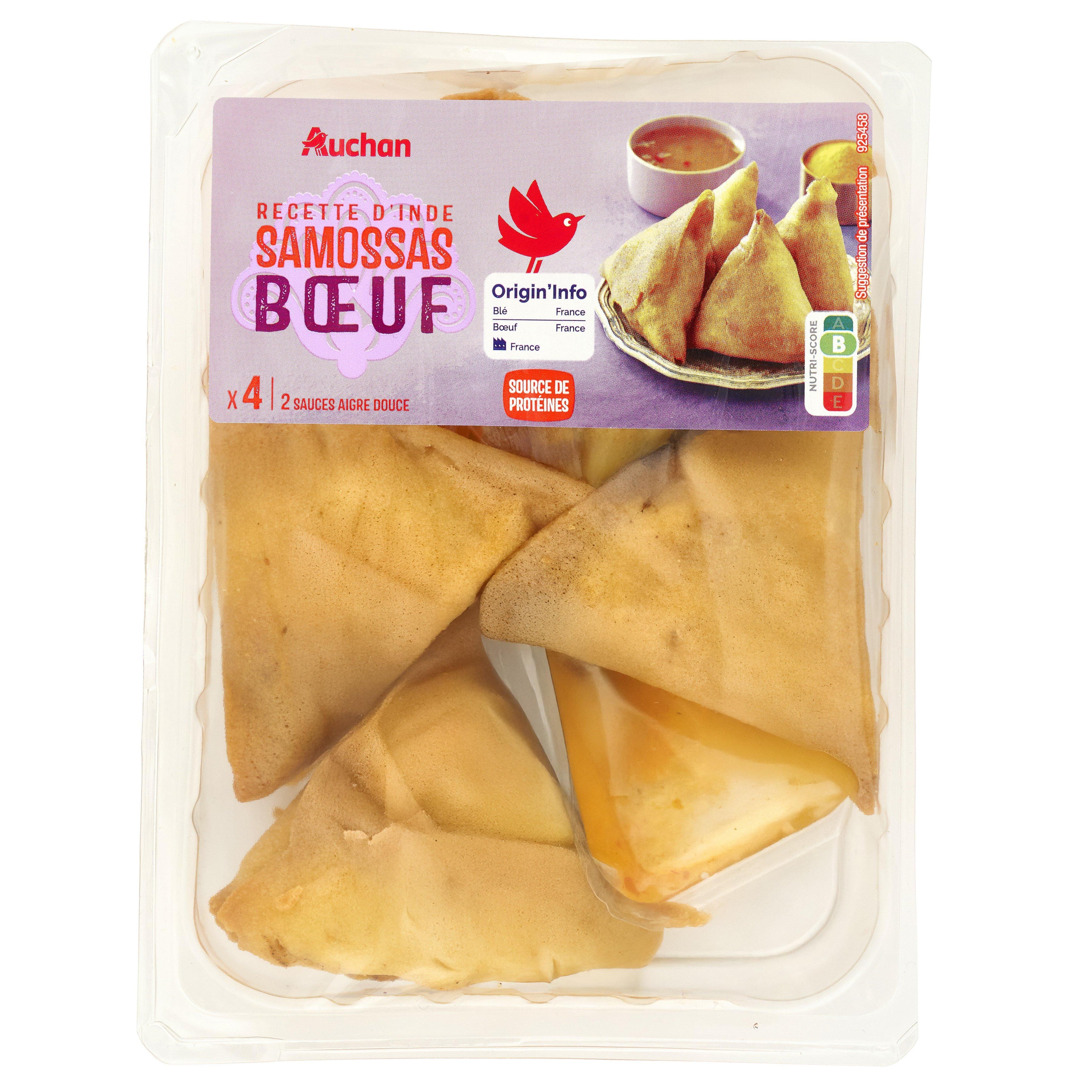 Ingrédients : Samossas au bœuf 83,3% : galette de BLÉ 29.9% (eau, farine de BLÉ, huile de tournesol, blanc d'OEUF en poudre, sel, émulsifiant : lécithine de colza), eau, oignon, viande de boeuf 8% (origine : France), vermicelle de pois réhydraté, carotte, protéine de SOJA texturée, sauce SOJA (eau, graines de SOJA, farine de BLÉ, sel), double concentré de tomates, huile de tournesol, curry (contient MOUTARDE), amidon de maïs, sel, piment.Sauce aigre-douce 16,7% : eau, sucre, vinaigre d’alcool, ananas, poivron rouge, amidon modifié de maïs, huile de tournesol, sel, acidifiant : acide citrique, épices et plantes aromatiques (curry, gingembre) épaississants : gomme guar, gomme xanthane.Pourcentages exprimés sur le total de la recette.Traces éventuelles de crustacés, poisson et lait.