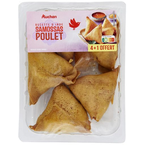 Ingrédients : Samossas au poulet frits 92.5%: Galette de blé 36.8% (eau, farine de blé, huile de tournesol, blanc d'oeuf en poudre, sel, curcuma, émulsifiant : lécithine de colza), oignon, viande de poulet 15.8%, carotte, courgette, protéine de soja texturée, poivron rouge, eau, coriandre, huile de tournesol, ail, sel, amidon de maïs, arôme naturel, sucre, gingembre, piment fort, poivre blanc. Sauce aigre douce 7.5% : Eau, sucres, vinaigre d’alcool, ananas, poivron rouge, amidon modifiée maïs, huile de tournesol, sel, acidifiant : acide citrique, épices etplantes aromatiques (curry, gingembre) stabilisants : gomme guar,gomme xanthane.Pourcentages exprimés sur le total de la recette.Traces éventuelles de crustacés, poisson et lait.Elaboré à partir de poulet origine France.