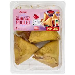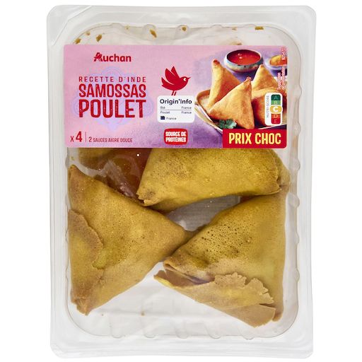 Ingrédients : Samossas au poulet 83,3% : galette de blé 29.9% (eau, farine de blé, huile de tournesol, blanc d'oeuf en poudre, sel, curcuma, émulsifiant : lécithine de colza), oignon, eau, viande de poulet 10.7% (origine : France), carotte, protéine de soja texturée, chapelure (farine de blé, sel), huile de tournesol, curry (contient moutarde), ciboulette, ail, sel, amidon de maïs, curcuma.Sauce aigre-douce 16,7% : eau, sucre, vinaigre d’alcool, ananas, poivron rouge, amidon modifié de maïs, huile de tournesol, sel, acidifiant : acide citrique, épices et plantes aromatiques (curry, gingembre) épaississants : gomme guar, gomme xanthane.Pourcentages exprimés sur le total de la recette.Traces éventuelles de crustacés, poisson et lait.