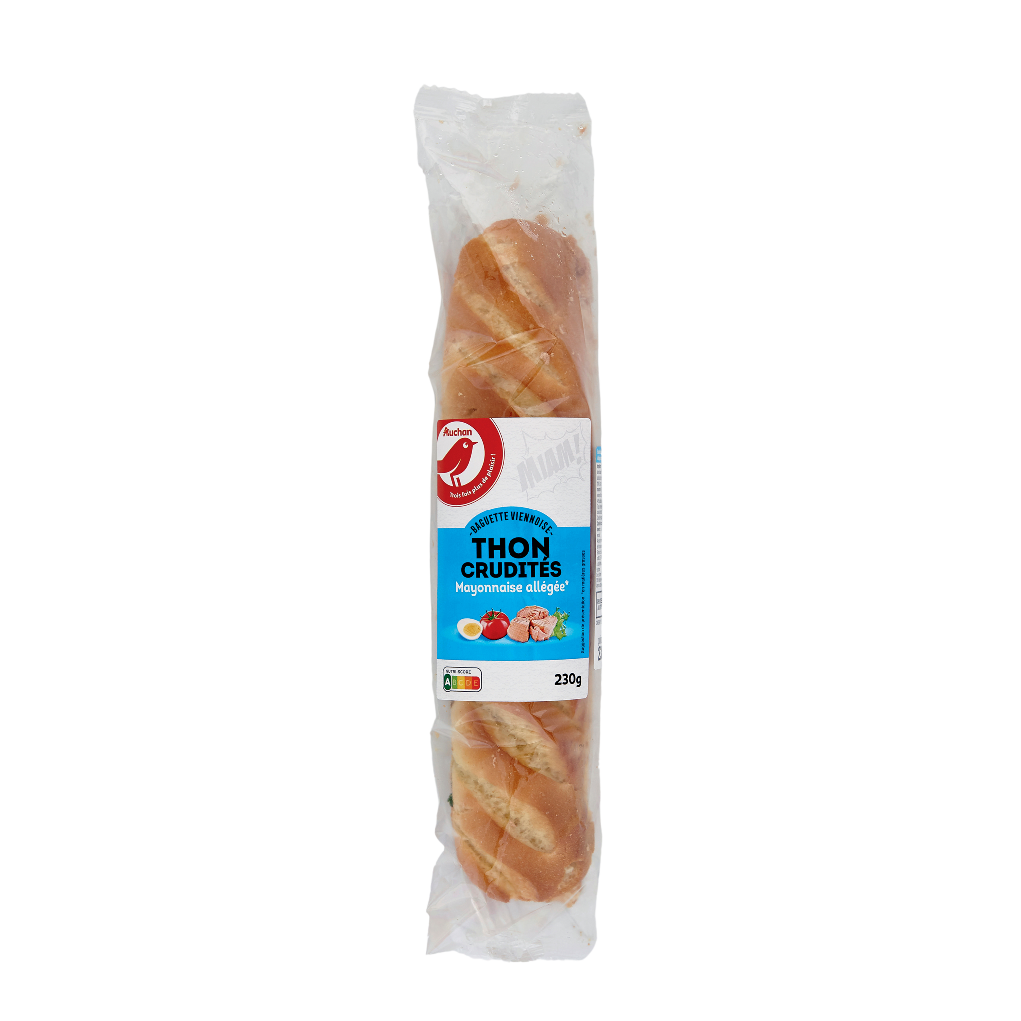 Baguette viennoise 52,2% (farine de blé, eau, huilede colza, œuf entier, sucre, farinede seigle, levure,sel, glutende blé, farinede blé malté, agentde traitement de la farine : acide ascorbique, colorant : riboflavines), morceauxde thon Listao au naturel (poisson) 17,4% (thon Listao, eau, sel), mayonnaise allégée en matières grasses 13,1% (eau, huile de colza, moutarde deDijon (eau, graines de moutarde, vinaigre d'alcool, sel), amidon, jaune d'œuf, vinaigre d'alcool, sucre,sel; épaississant : gomme guar), tomate 8,7%, salade 4,3%, oeufs 4,3% (oeufs, eau, acidifiant : acide citrique).Traces éventuelles de lait, crustacés, graines de sésame,céleri, soja, fruits à coque et autres céréalescontenant du gluten.Pourcentages exprimés sur le total de la recette.