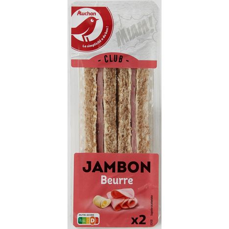 Sandwich au pain de mie complet garni de jambon cuit standard et de beurre.