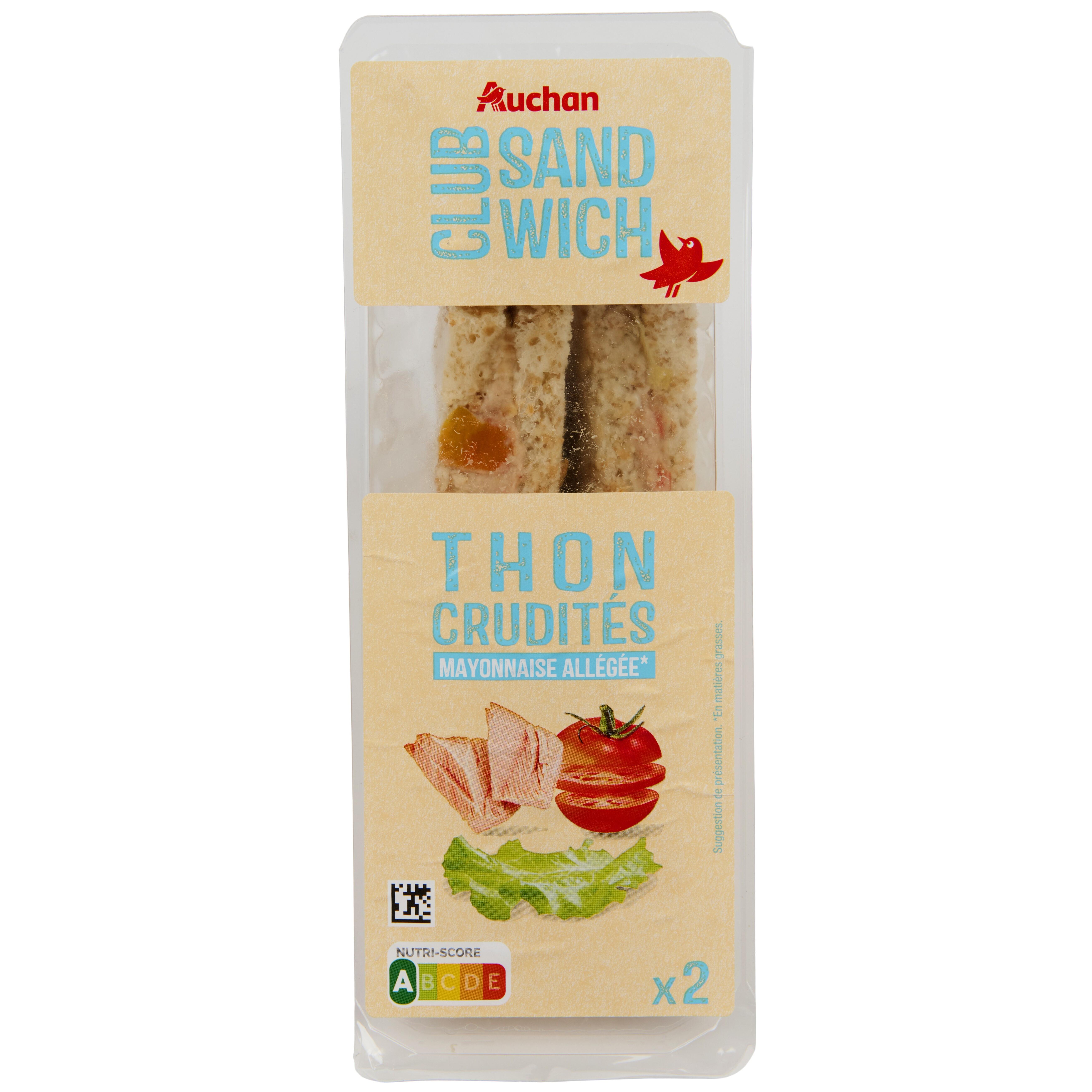 Ingrédients : Pain de mie complet 48,3% (farine complète de blé, eau, huile de colza, sucre, levure, sel, gluten de blé, farine de blé, dextrose, émulsifiant : mono et diglycérides d'acides gras, agent de traitement de la farine : acide ascorbique), thon Listao au naturel 20,7% (thon Listao 19,7%, eau, sel) , mayonnaise allégée en matières grasses* 13,8% [eau, huile de colza, vinaigre d'alcool, jaune d'oeuf, amidon modifié de pomme de terre et/ou maïs, sucre, moutarde de Dijon (eau, graines de moutarde, vinaigre d'alcool, sel), sel, lait écrémé reconstitué, épaississant : gomme xanthane, acidifiant : acide citrique], tomate 13,8%, salade 3,4%.Traces éventuelles de graines de sésame et soja.Pourcentages exprimés sur le total de la recette. *Réduction d’au moins 30% de la teneur en matières grasses par rapport à la moyenne des mayonnaises classiques.