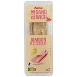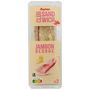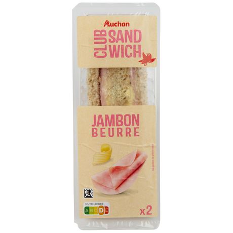 Ingrédients : Pain de mie complet 56% (farine complète de BLÉ, eau, huile de colza, sucre, levure, sel, GLUTEN de BLÉ, farine de BLÉ, dextrose, émulsifiant : mono et diglycérides d'acides gras, agent de traitement de la farine : acide ascorbique), jambon cuit standard 35,6% [jambon de porc 21,8% (origine UE), eau, acidifiant : lactate de sodium, dextrose, protéines de sang, sel, arômes naturels, stabilisants : diphosphates, triphosphates antioxydant : ascorbate de sodium, conservateur : nitrite de sodium], beurre (LAIT) 8%. Traces éventuelles de moutarde, oeufs, poissons, graines de sésame et soja. Pourcentages exprimés sur le total de la recette.