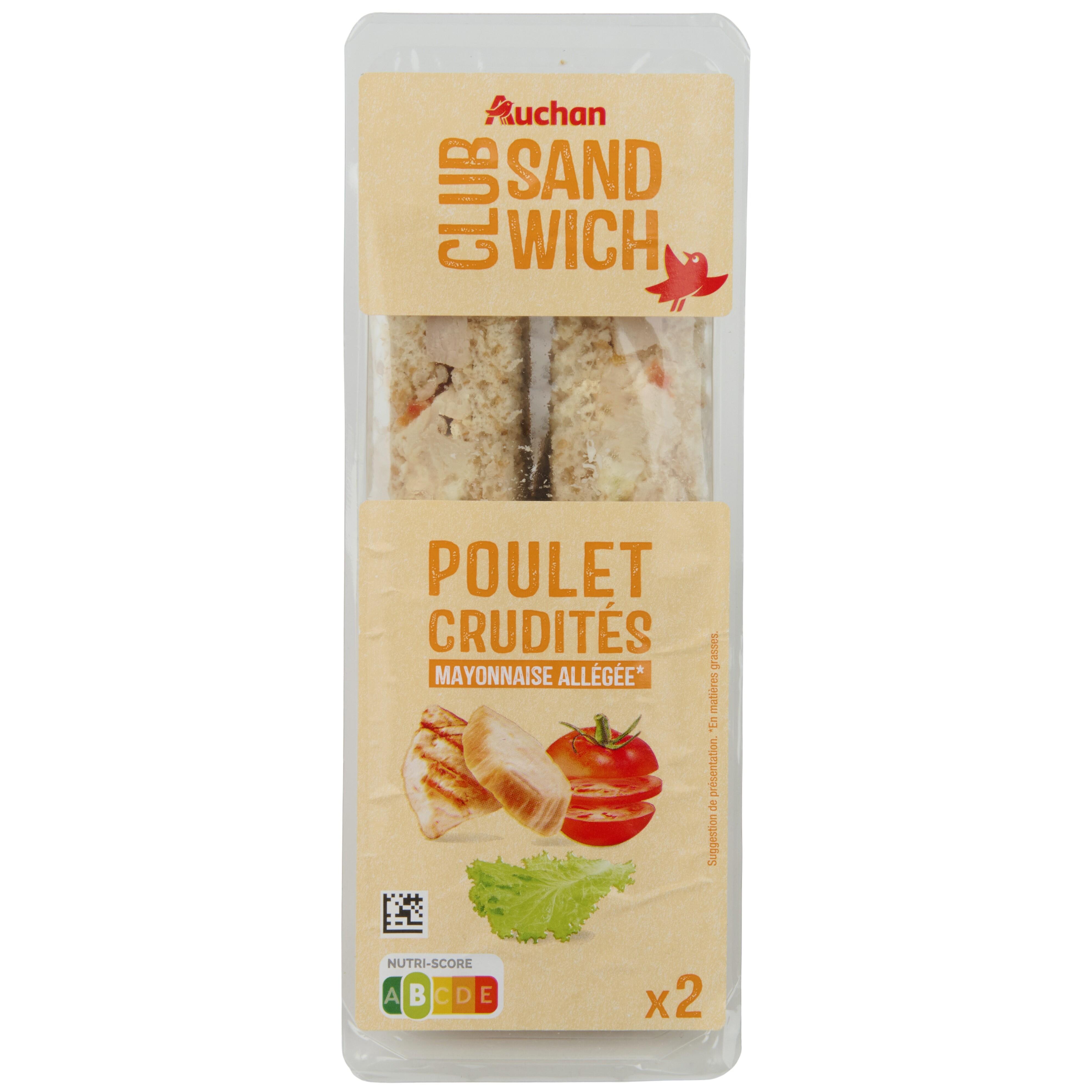 Ingrédients : Pain de mie complet 48,2% (farine complète de blé, eau, huile de colza, gluten de blé, sucre, sel, dextrose, levure, farine de blé, émulsifiant : mono et diglycérides d'acides gras, agent de traitement de la farine : acide ascorbique), mayonnaise allégée en matières grasses 13,8% [eau, huile de colza, vinaigre d'alcool, jaune d'œuf, amidon modifié de pomme de terre et/ou maïs sucre, moutarde de Dijon (eau, graine de moutarde, vinaigre, sel), sel, lait écrémé reconstitué, acidifiant : acide citrique, épaississant : gomme xanthane], poulet traité en salaison rôti 12,1% [viande de poulet 11,6% (origine UE), dextrose, sel], viande de poulet traitée en salaison rôti 12,1% [viande de cuisse de poulet 11,8% (origine UE), dextrose, sel], salade 6,9%, tomate 6,9%.Traces éventuelles de poissons, graines de sésame et soja.Pourcentages exprimés sur le total de la recette. *Réduction d’au moins 30% de la teneur en matières grasses par rapport à la moyenne des mayonnaises classiques.