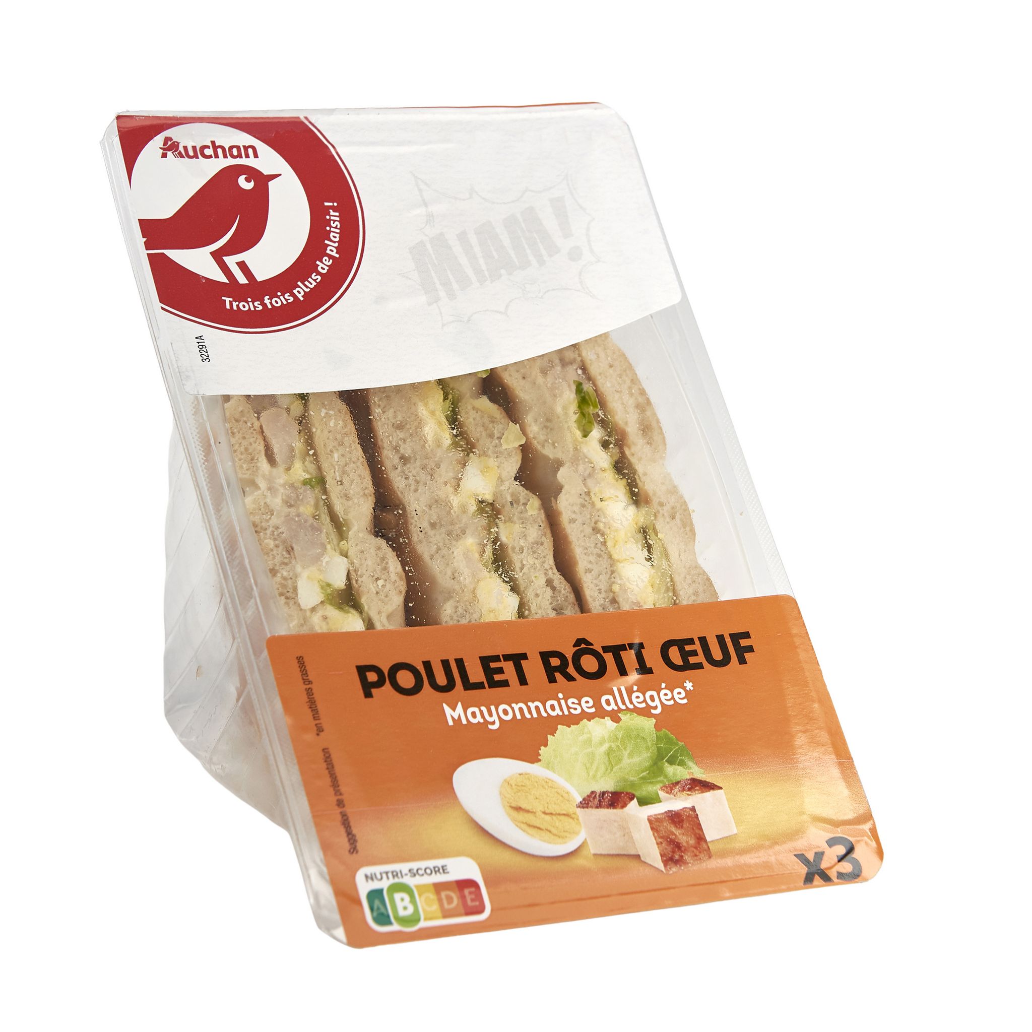 Sandwich au pain spécial polaire garni de dès de viande de poulet rôti cuit traité en salaison, de mayonnaise allégée en matières grasses*, d’œuf et de salade.