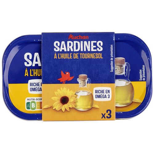 Ingrédients : Sardines (POISSONS) ( Sardina pilchardus ) 70 %, huile de tournesol (Origine : Maroc ou UE), sel. Sardines pêchées en océan Atlantique Centre-Est.
