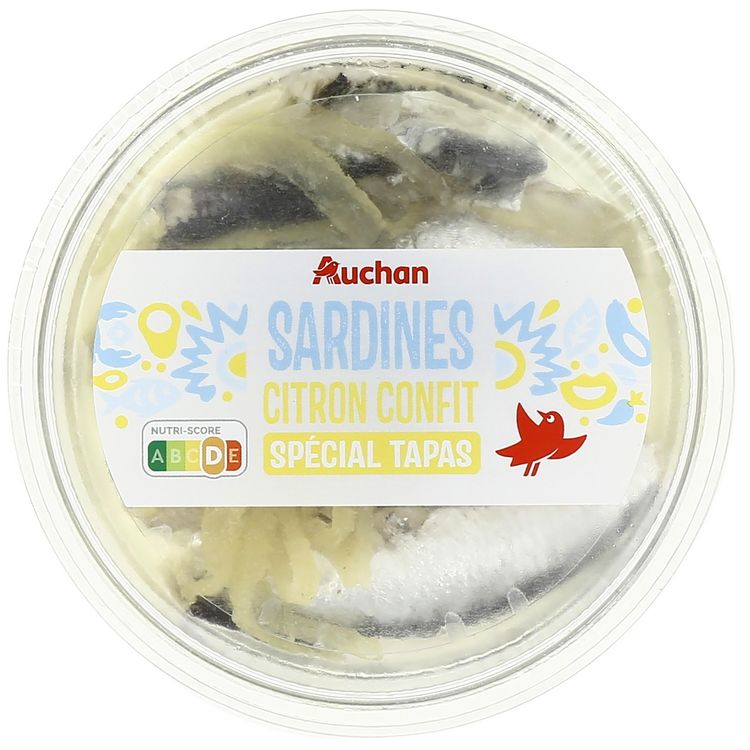 Ingrédients : INGRÉDIENTS: Filets de sardines (POISSONS) marinés 70% ( filets de sardines (POISSONS), vinaigre d'alcool, sel, jus de citron), huile de colza, zestes de citron confit avec son jus 10% (sucre, citron 4,4%, eau, jus concentré de citron), huile de tournesol. Traces éventuelles de : céréales contenant du gluten, crustacés, oeufs, lait, moutarde, graines de sésame, sulfites, mollusques.