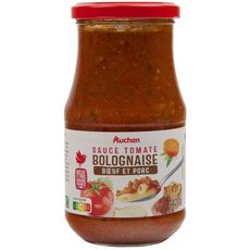 Ingrédients : Eau, purée de tomates mi-réduite et pulpe de tomates au jus (tomates origine Italie et/ou Espagne et/ou France) 41,3%, légumes 8% (carottes 4%, oignons 4%), viande bovine cuite origine France 6,3% (soit 9% de viande crue), viande de porc cuite origine France 5,6% (soit 8% de viande crue), huile de colza, sucre, amidon modifié de maïs, sel, persil, acidifiant : acide lactique, arôme naturel, ail. Traces éventuelles de céleri et de lait.