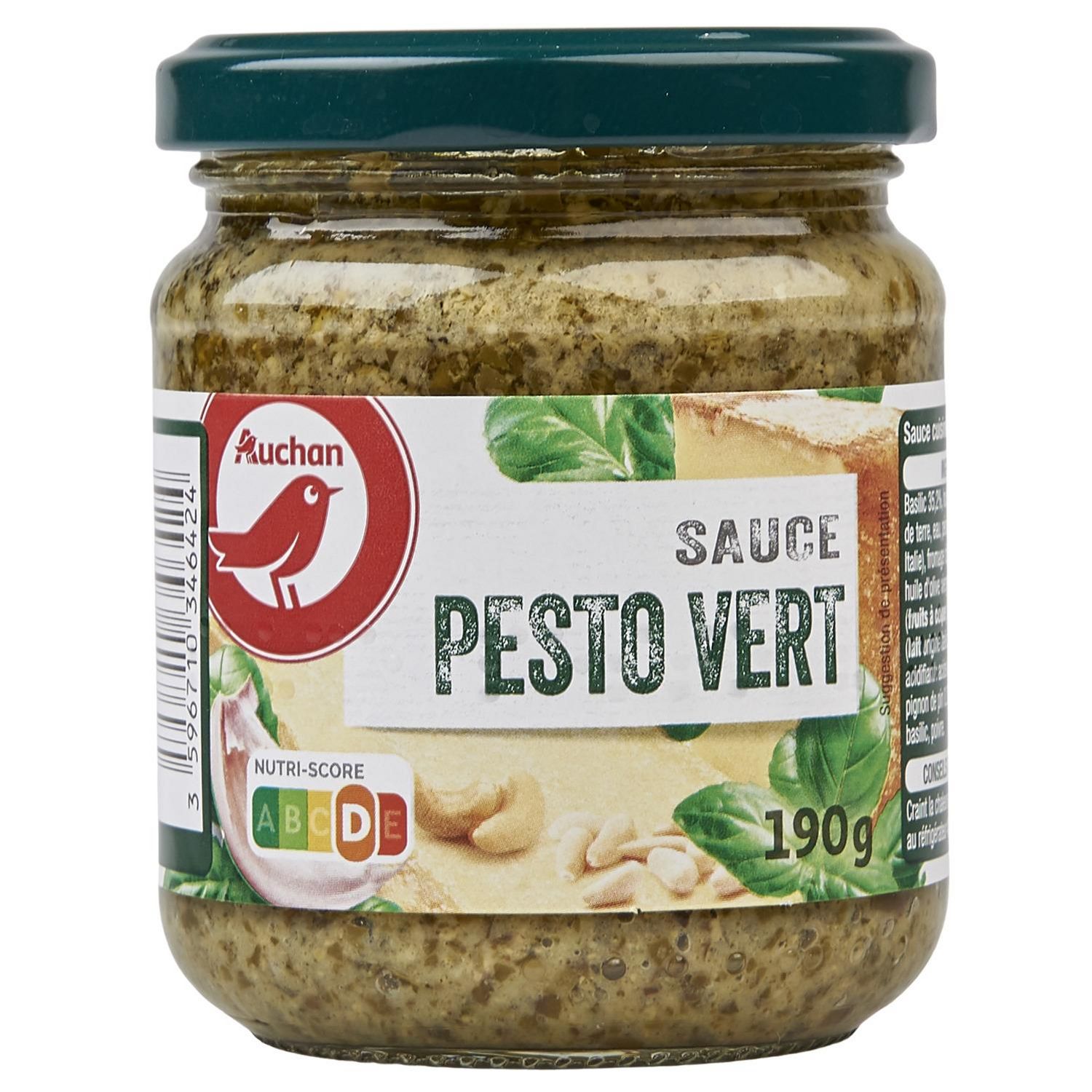 Ingrédients : Basilic 35,2%, huile de tournesol, pommes de terre, eau, pécorino 3,1% (LAIT origine Italie), fromage râpé 3,1% (LAIT origine UE), huile d'olive vierge extra, sel, noix de cajou (FRUIT À COQUE), ail 1%, grana padano 1% (LAIT origine Italie contient ŒUFS), acidifiant : acide lactique, fibre d'agrume, pignon de pin 0.2%, arôme naturel de basilic, poivre.