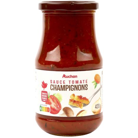 Ingrédients : Purée et pulpe de tomates (tomates origine France) 75%, légumes 9 % (oignons 5%, carottes 4%), champignons réhydratés 4,24% (bolets jaunes 3.24%, champignons noirs 0.6%, cèpes 0.2% et girolles 0.2%), champignons de Paris 4%, huile de tournesol, sel, amidon modifié de maïs, sucre, épices et plantes aromatiques, arôme naturel de champignon, acidifiant : acide lactique. Traces éventuelles de céleri, lait et moutarde.