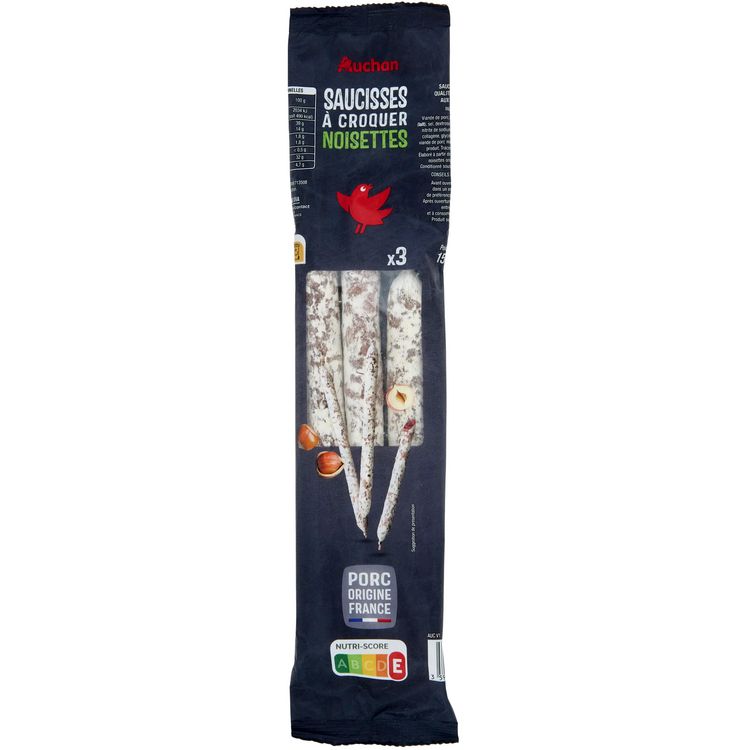 Ingrédients : Viande de porc, NOISETTES 10%, lactose (LAIT), sel, dextrose, poivre, ail, conservateur : nitrite de sodium, ferments. Enveloppe : collagène, glycérine, cellulose. 164 g de viande de porc mis en oeuvre pour 100 g de produit. Traces éventuelles de noix. Elaboré à partir de porc origine France et de noisettes origine Turquie et Italie.