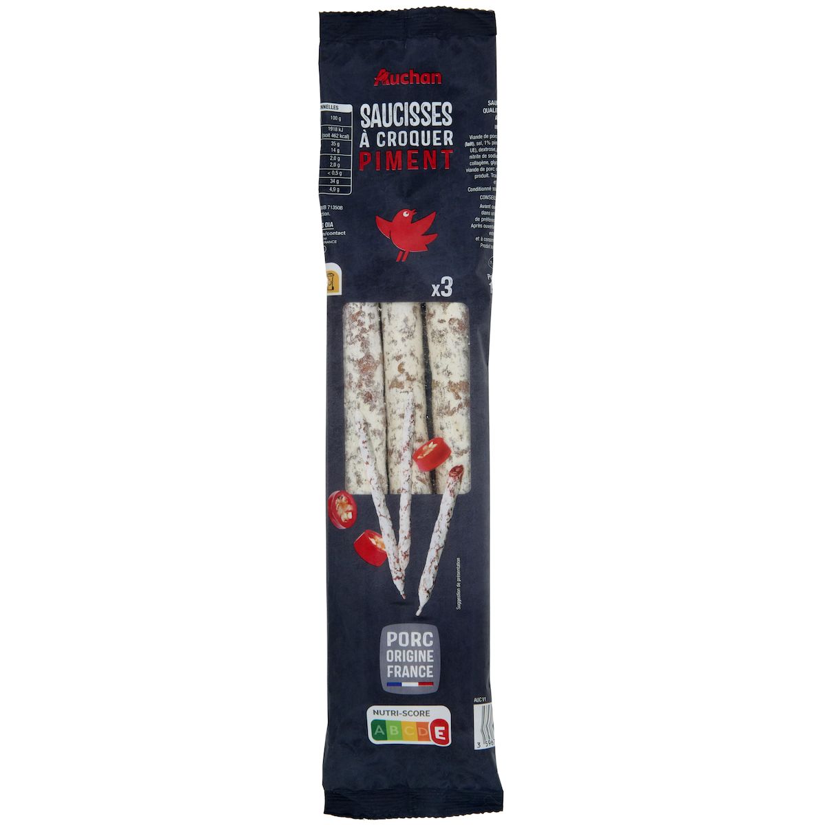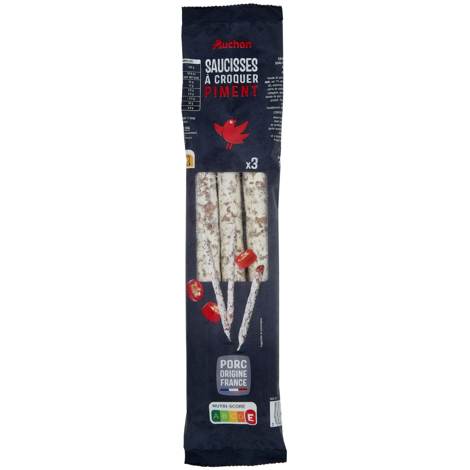 Ingrédients : Viande de porc (origine France), lactose (lait), sel, 1% piment fort (origine UE ou hors UE), dextrose, poivre, ail, conservateur : nitrite de sodium, ferments. Enveloppe : collagène, glycérine, cellulose. 173 g de viande de porc mis en oeuvre pour 100 g de produit. Traces éventuelles de noix et de noisettes.