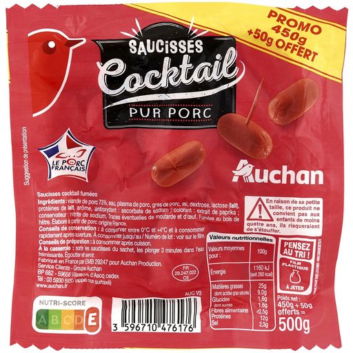 450 grammes de saucisses cocktail pur porc donc non hallal de très bon gout et comme elles sont bonnes on nous en rajoute 50 grammes
