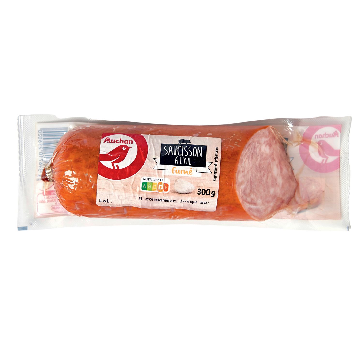 Ingrédients : Viande de porc 82%, eau, sel, plasma de porc sec, sirop de glucose, correcteur d'acidité : citrates de sodium, épices et plantes aromatiques, ail déshydraté 0,25%, dextrose, antioxydant : ascorbate de sodium, colorant : rouge de betterave, conservateur : nitrite de sodium. Fumé au bois de hêtre. Elaboré à partir de porc origine UE et d'ail ne provenant pas de France. Traces éventuelles de céleri, gluten, lait, moutarde, œuf, fruits à coque, soja et sulfites.