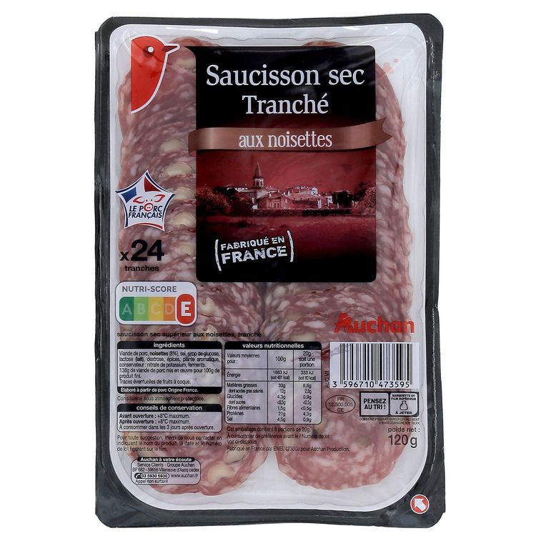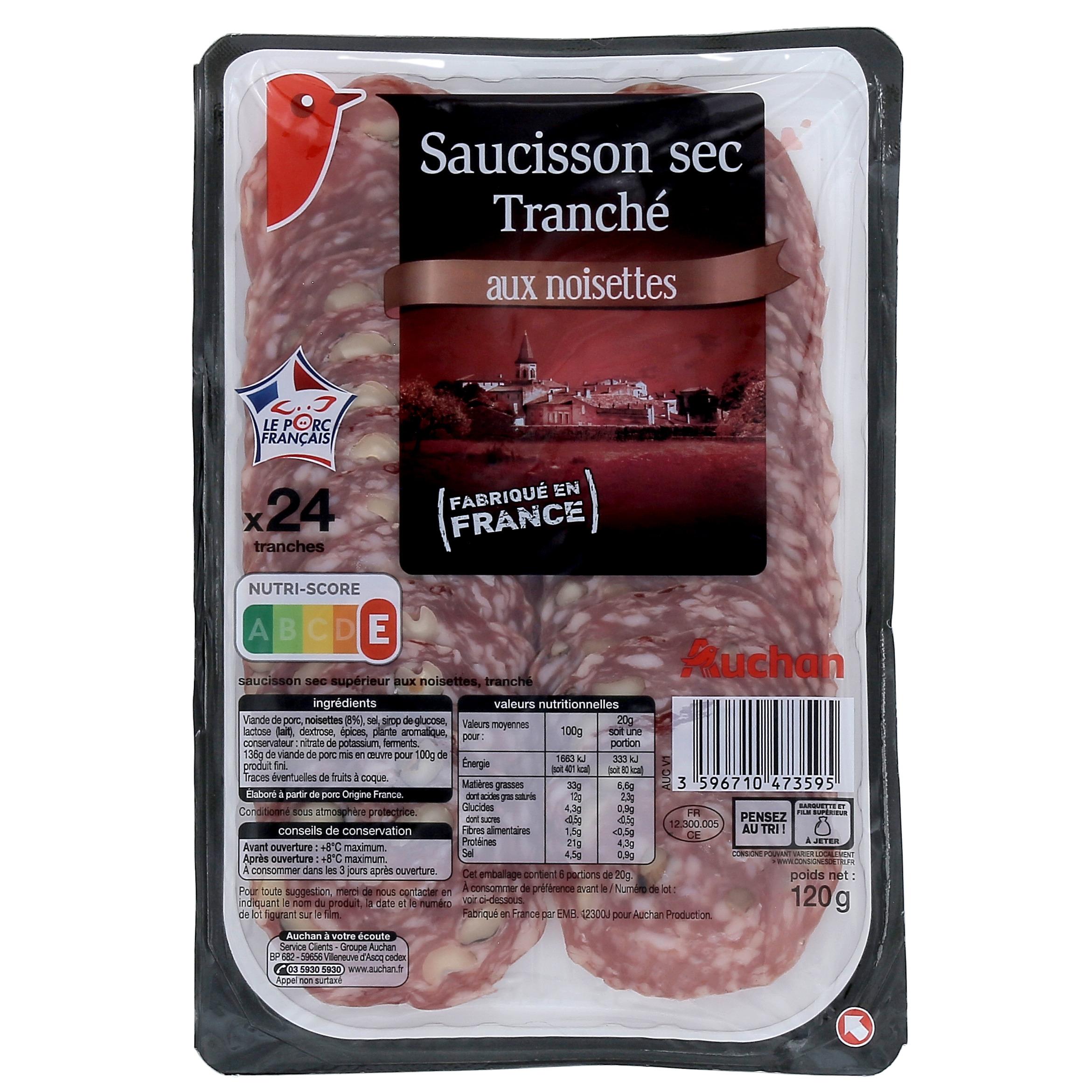 Découvrez le Saucisson Sec tranché aux Noisettes Auchan. Un saucisson aux saveurs délicates de noisettes. Fabriqué avec de la viande de porc d'origine France, ce saucisson sec est le compagnon idéal pour vos apéritifs en famille ou entre amis.