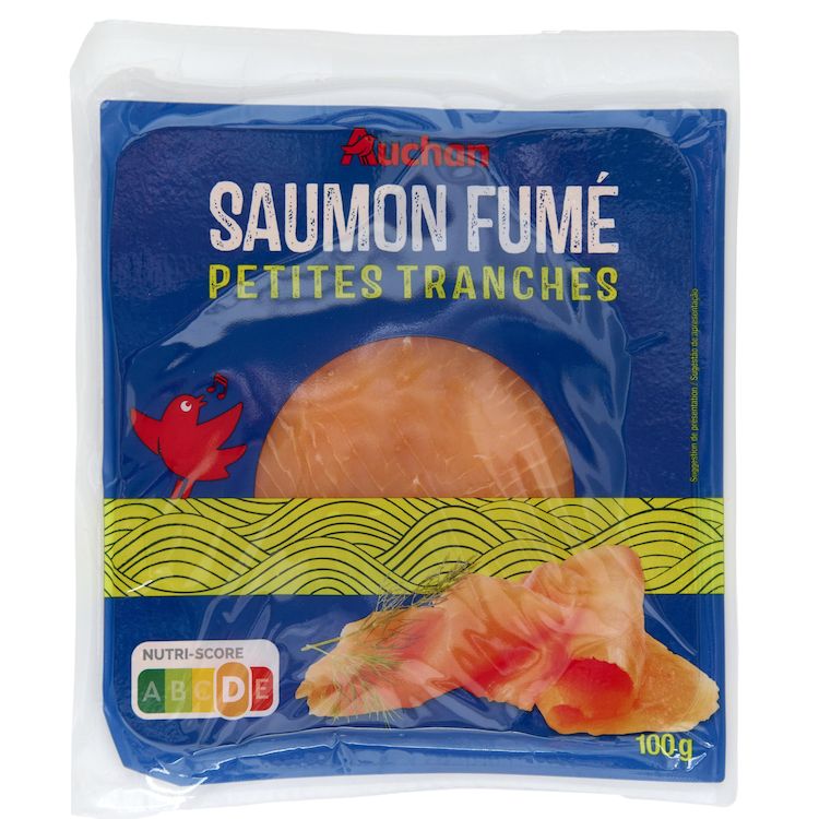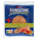 Petites tranches de saumon atlantique (Salmo salar),élevé en Norvège, fumé au bois de hêtre. Produit décongelé, ne pas recongeler.